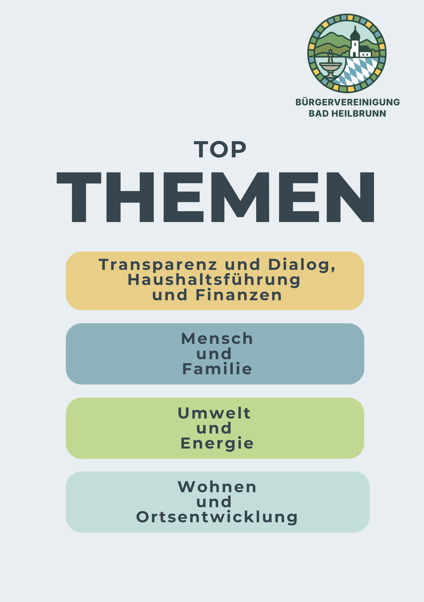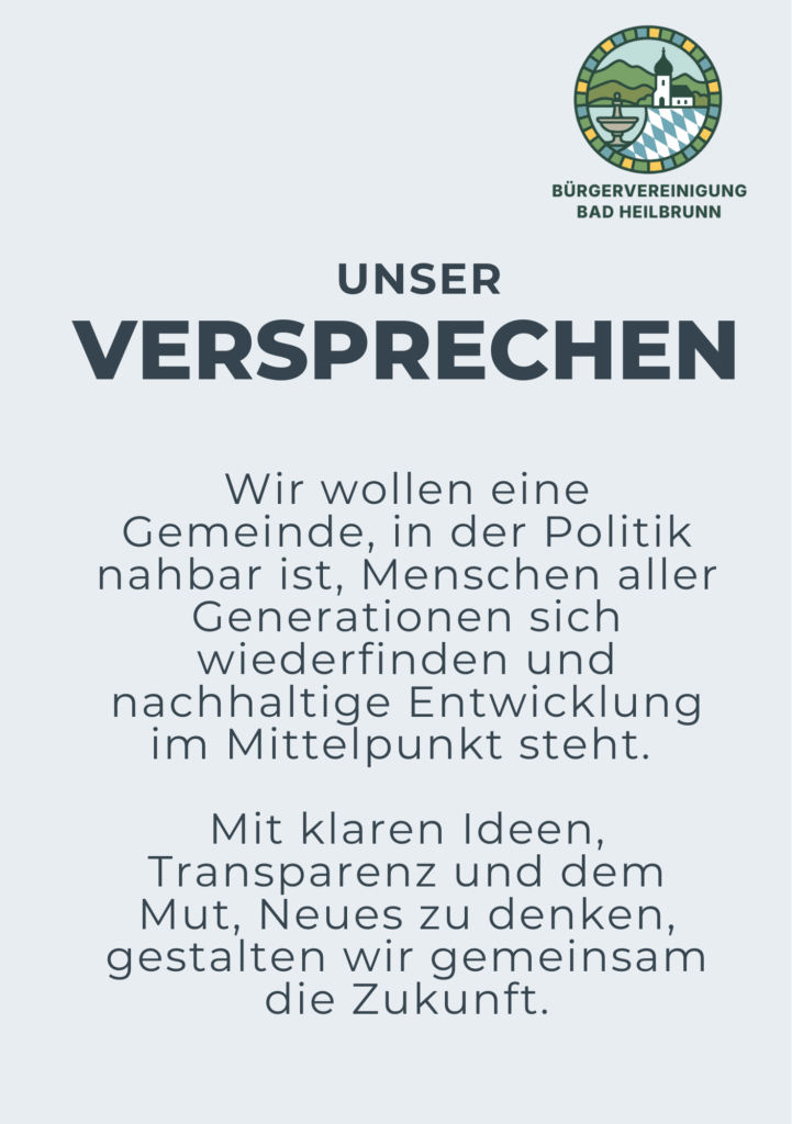 Mit unseren Kandidatinnen und Kandidaten für das Bürgermeisteramt und den Gemeinderat möchten wir zeigen, wie Gemeindepolitik aussehen kann, wenn sie nahbar, offen und zukunftsorientiert ist. Für ein Bad Heilbrunn, das sich entwickelt, ohne sich zu verlieren – mutig und modern – aber mit Maß, Herz und Verstand.
