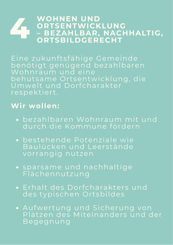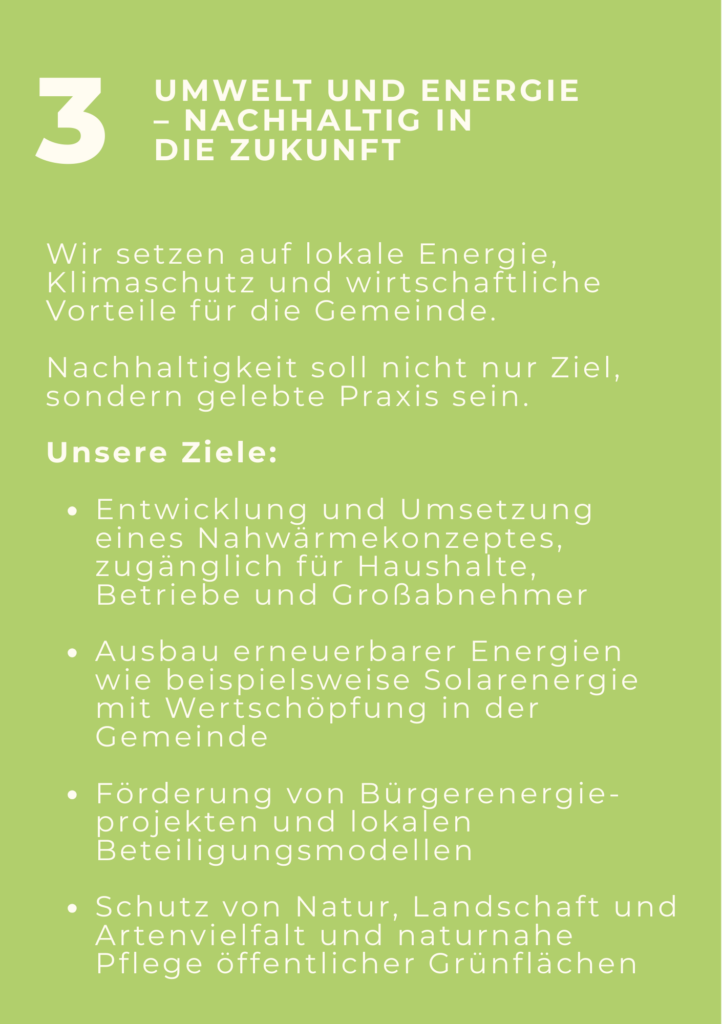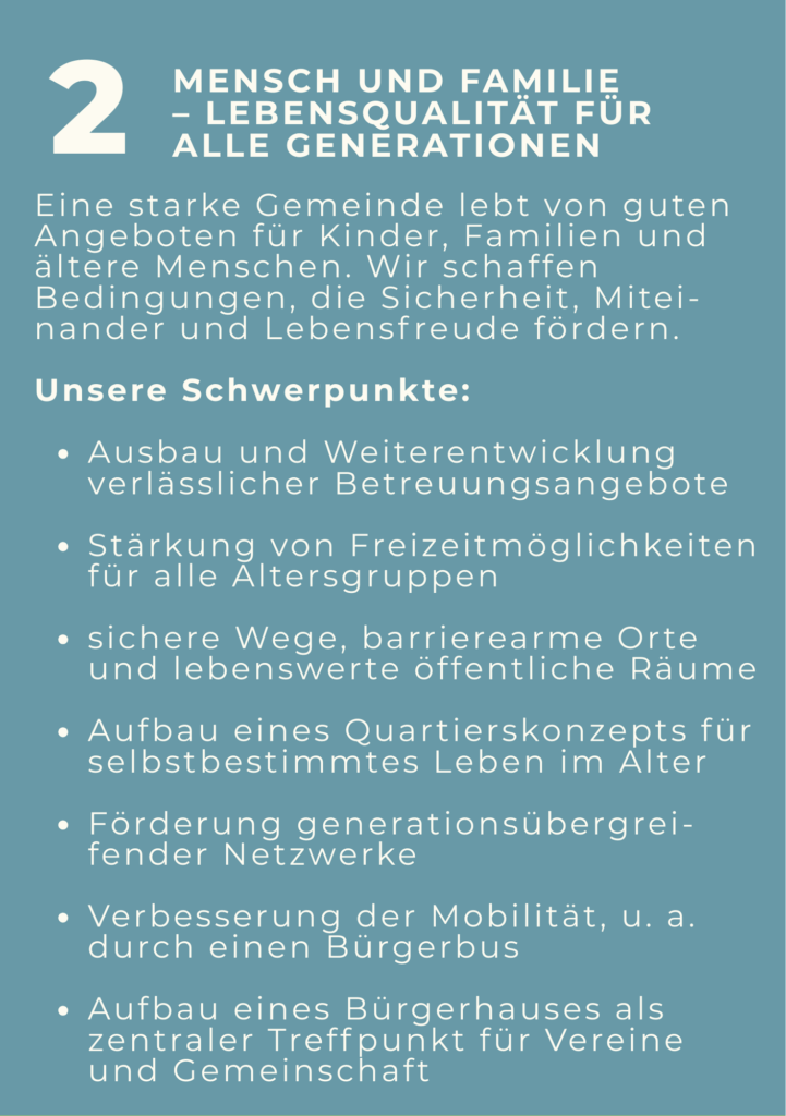 Was uns antreibt? Transparenz, Bürgernähe und frischer Wind in der Gemeindepolitik. Und der Wille, Wandel sinnvoll und Schritt für Schritt anhand eines Leitbildes zu gestalten. Wir hören zu. Wir fragen nach. Wir binden ein. Und vor allem: Wir gestalten mit den Menschen unseren Ort.